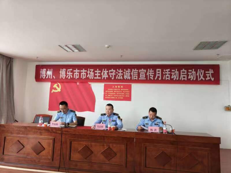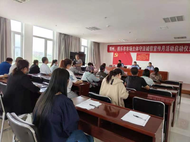 5月19日,博州、博乐市市场监督管理局开展“社会共治,同心携手维护守法诚信市场环境”为主题的市场主体守法诚信宣传月活动启动仪式,会议由博乐市市场监督管理局党组成员、局长李新鹏主持,博州市场监督管理局党组成员、副局长吴志疆、信用广告监管科科长杨洪参加,诚挚邀请了餐饮、食品、药品、棉业等重点行业的20家企业代表、1名协会代表参加。