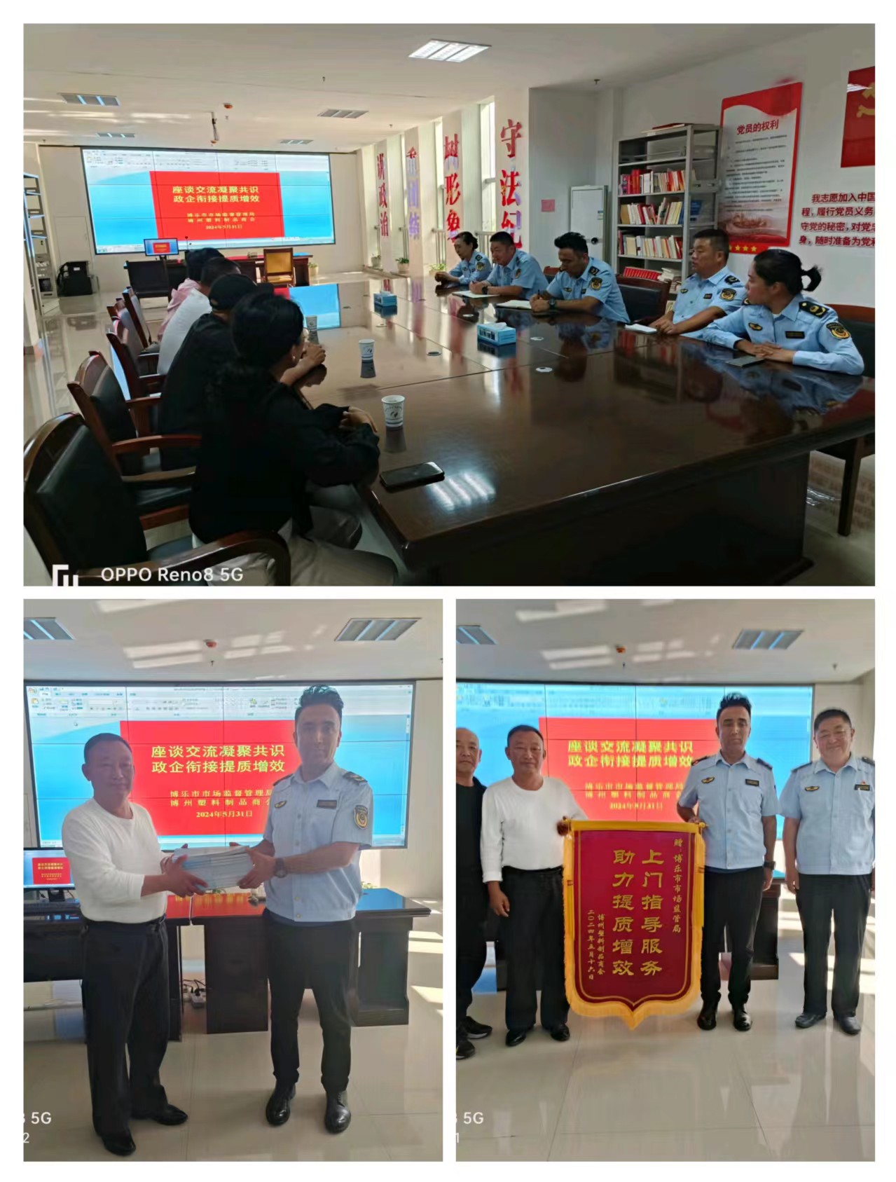 5月31日由博乐市市场监管局、博州塑料制品商会联合举办了以“凝心聚力,政企衔接提质增效”为主题的交流座谈会,商会成员单位代表和该局各业务科室负责人畅谈、交流了塑料制品商会和相关企业发展历程、面临的问题和发展前景,充分肯定了市场监管部门“靠前服务、优质服务”为企业带来的便捷和助力企业提升发展能力的默默奉献和辛勤付出,进一步凝聚了政企携手共行、共谋发展的基层力量。商会会长李建明激动地说道“从一看到穿制服的来了就想到又是来罚款的、找事儿的到融入式的这种“执法+服务”新模式,令人非常高兴,也特别暖心,同时极大地激励了企业健康发展的潜质”。会后,还将一面印有“上门指导服务,助力提质增效”的锦旗赠于博乐市市场监督管理局,对用高效优质服务来帮助企业健康有序生产经营的暖心举措表示感谢!