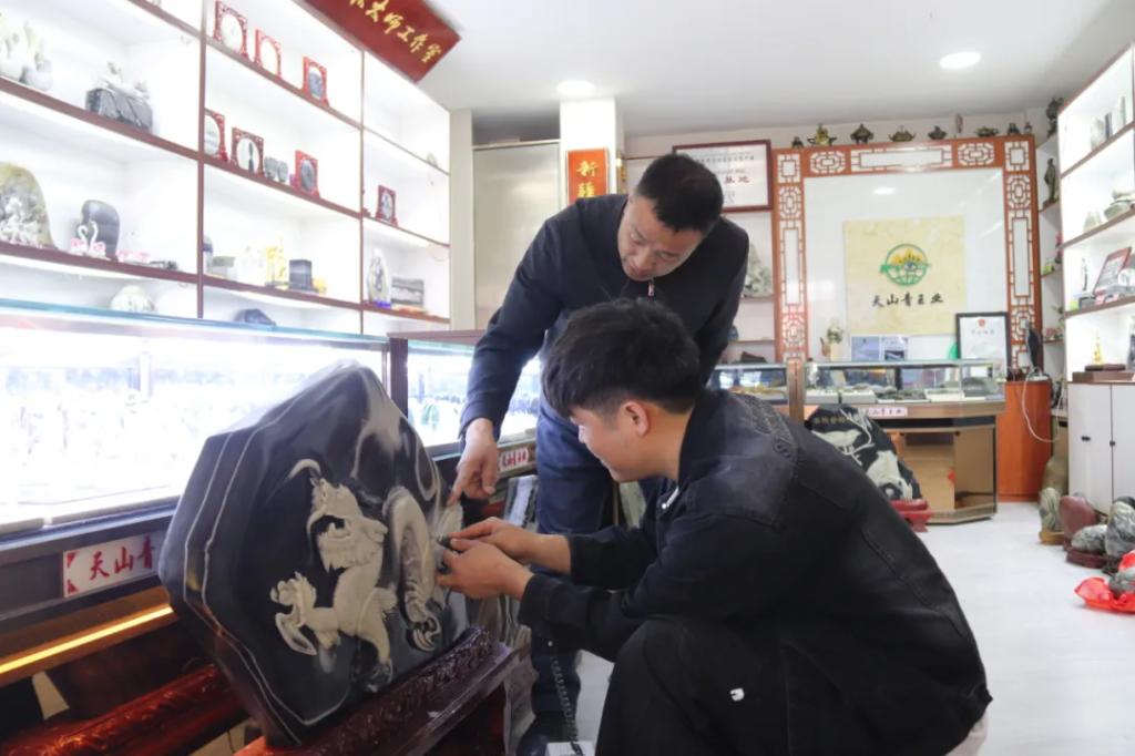 为帮助更多群众增收致富,天山青技能大师工作室领办人高伟伟成立了博乐市天山青石业有限责任公司,通过“老带新”和边生产边传技的模式,培养了大批雕刻师傅,多次在博州内外开办石雕展。