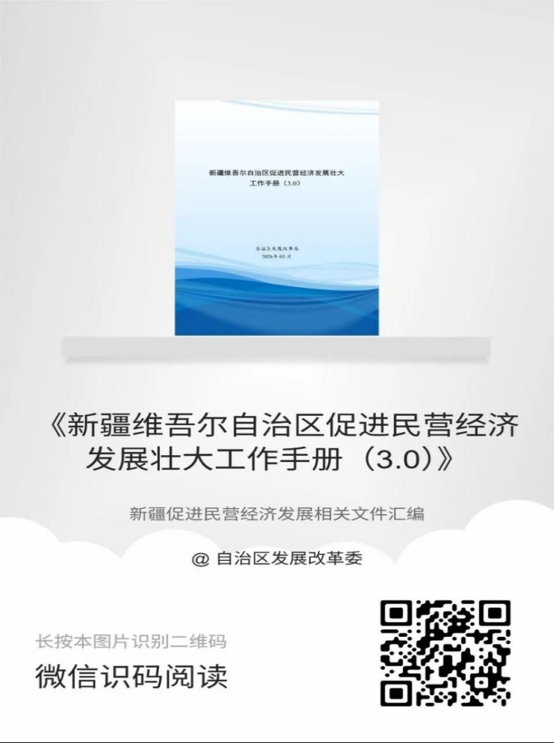 《工作手册》摘编了习近平总书记关于民营经济的重要论述,包含法律法规、政务服务、公平准入、要素保障、金融支持、产业政策、权益保护、企业培育等八方面99个政策文件,并依托官方网站、政务微信等政务平台向社会公开发布《工作手册》二维码,企业可通过识别二维码查阅相关文件。下一步,自治区发展改革委将会同各相关部门持续做好动态更新和补充完善,确保政策内容时效性、精准性,全力为自治区民营经济高质量发展提供政策支撑。