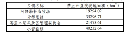 一、依据水利部《禁止开垦陡坡地范围划定技术指南》,划定全市禁止开垦陡坡地面积116296.98公顷。涉及小营盘镇、青得里镇、赛里木湖风景区管理委员会及阿热勒托海牧场,具体分布范围和面积见附件。