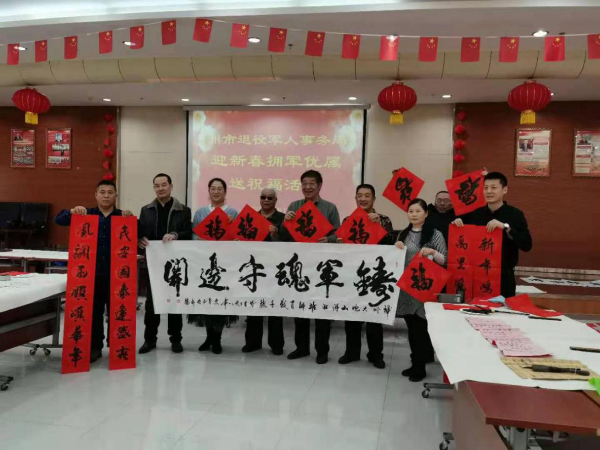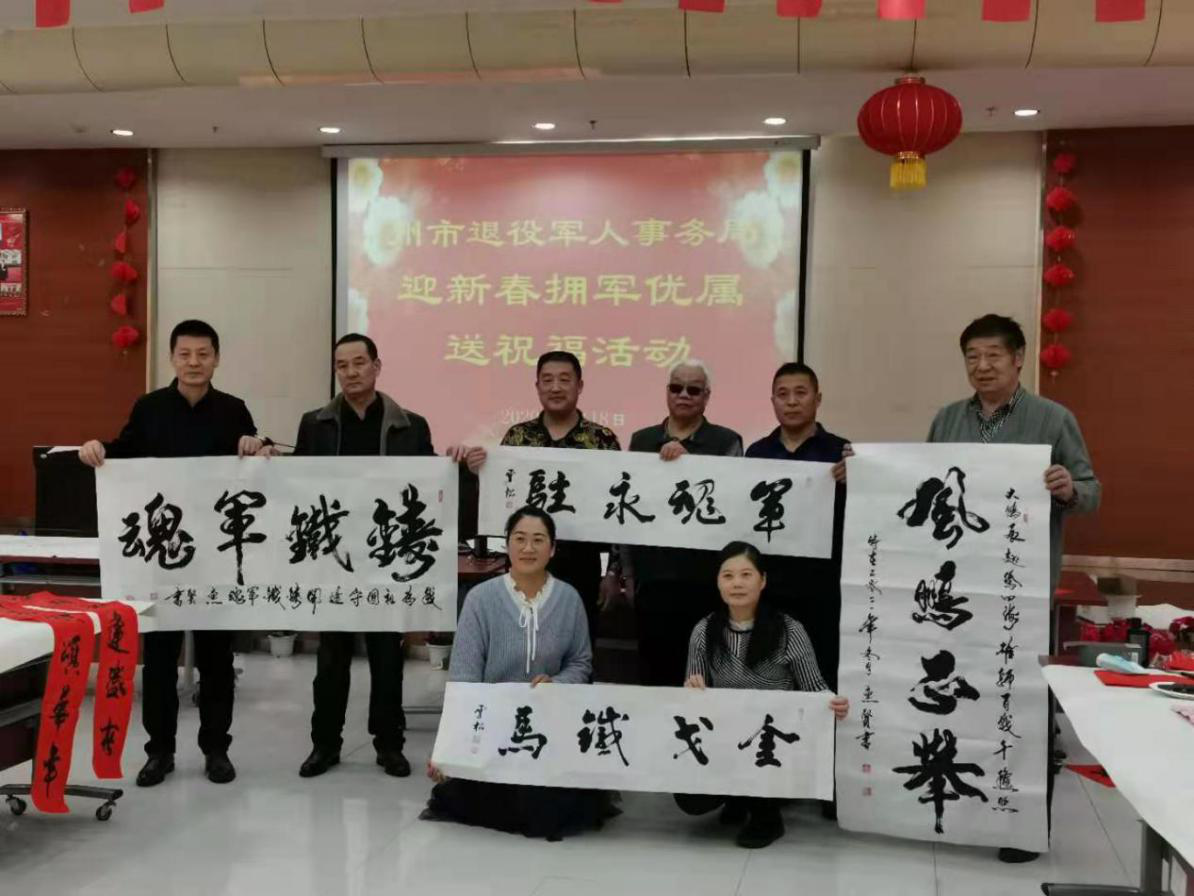 1月22日,州市双拥办通力合作,协调场所、书写基本用品,由市文联牵头邀请6名博乐市德高望重、笔酣墨饱的书法老师现场书写书法作品、新春对联,内容为突出军旅元素、春节喜庆特色,讴歌当代军人的光荣,向人民子弟兵送上了深深的祝福和崇高的敬意。